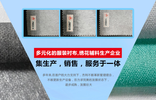 多年来, 杰利服装刺绣辅料有限公司在客户的大力支持下,杰利不断革新管理理念,不断更新生产设备,在力求良好的发展状态下,逐步成熟,发展壮大。如今杰利下属设有杰利衬布厂,杰利无纺布厂,杰利胶黏制品厂,杰利蜡纸厂.2008年,公司在印尼万隆市设立无纺布分厂。2012年在泰国设立分厂,并将陆续在土耳其等国家地区设立分厂。